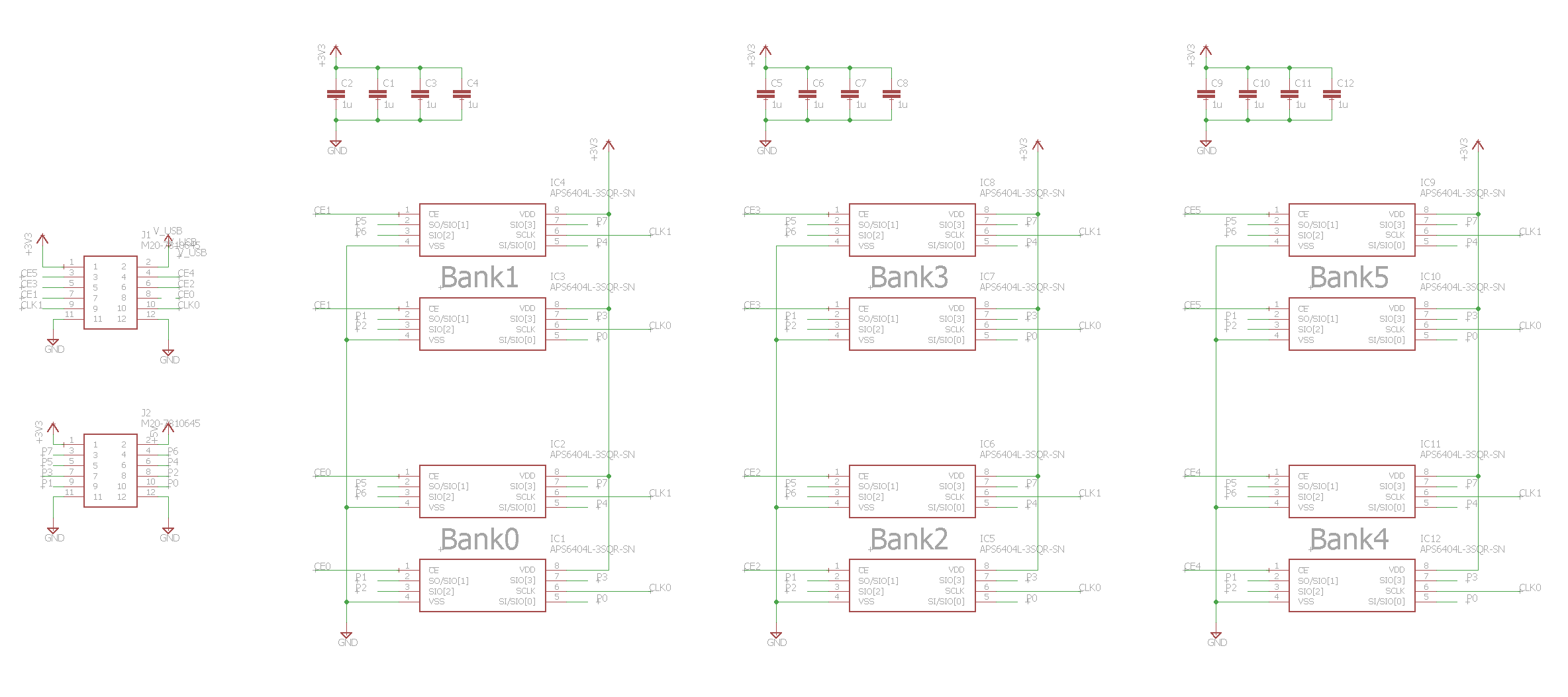 Uses twelve 64 Mbit (8 MByte) PSRAM chips for 96 MB total on a single 8-bit bus (chip part # is APS6404L-3SQR-SN)