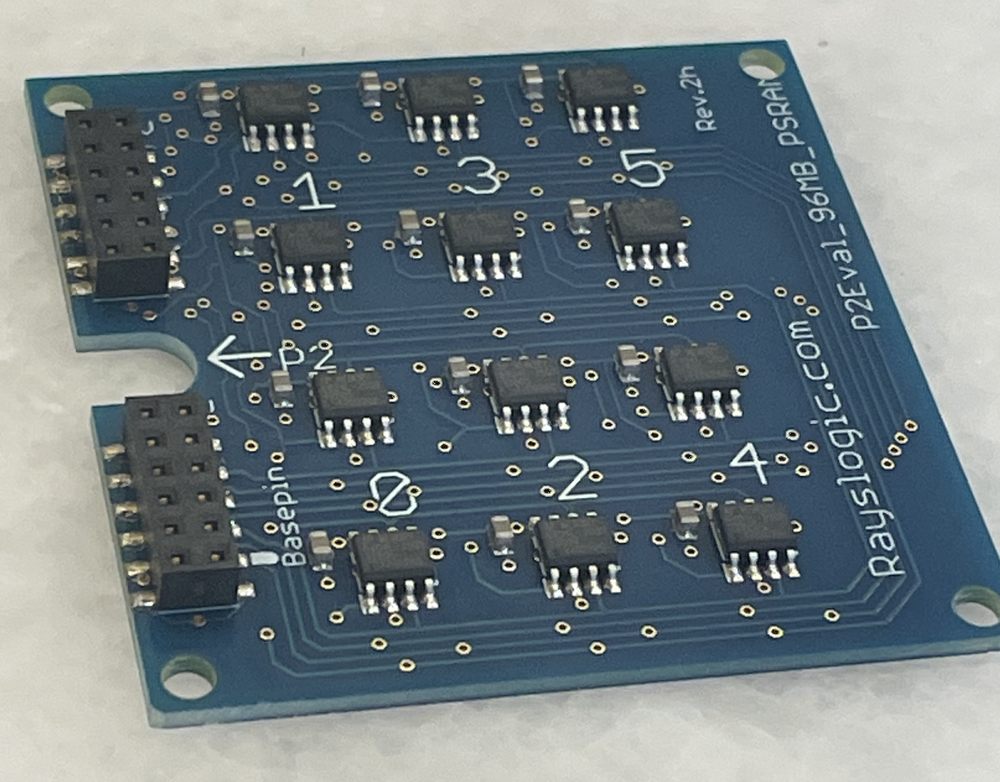 The P2EVAL_96MB_PSRAM is a memory board design to connect directly to a pair of 12-pin headers on a P2 Eval compatible board